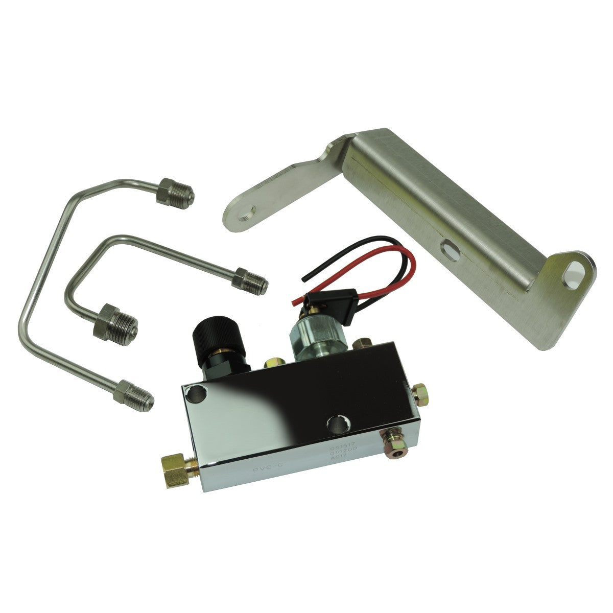 This chrome five-port adjustable proportioning valve supplies fluid to all four wheels but only adjusts the pressure to the rear. Includes brake light switch, lead wire, mounting bracket (mounts under master cylinder), and master cylinder lines.