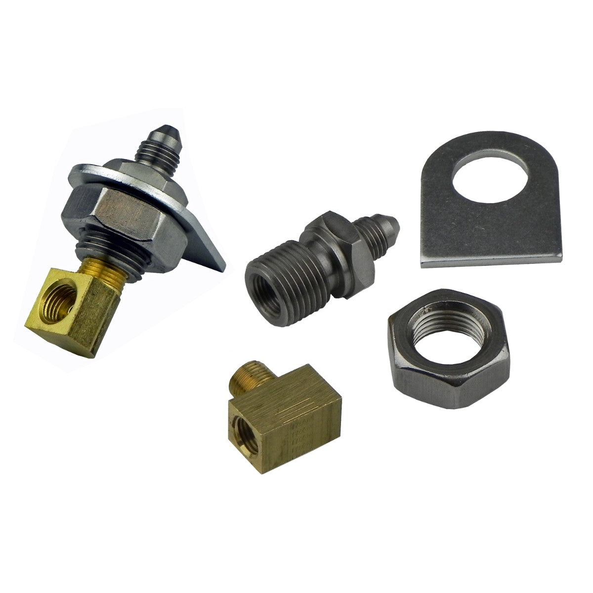 Pipe Bracket Kit - Female 3/16" Pipe to 3 AN Male - Cad Steel (Kit comes with (2) fittings (2) brackets (2) nuts (1) tee (1) elbow)