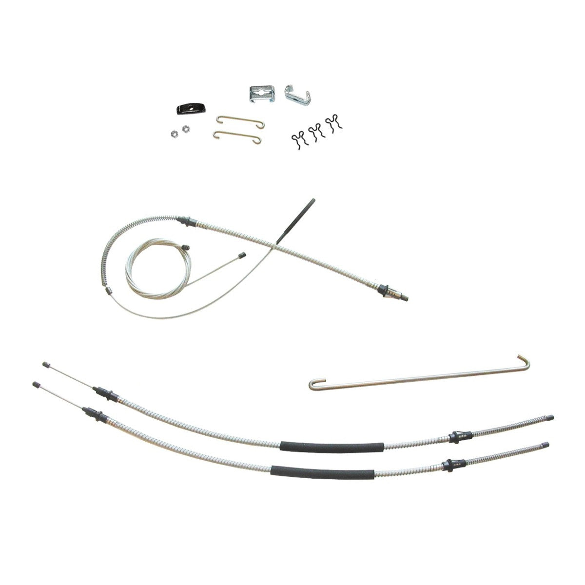 This complete parking brake cable kit replaces all the parking brake cables on your vehicle and includes the front, intermediate, and rear cables as well as all pictured hardware.
