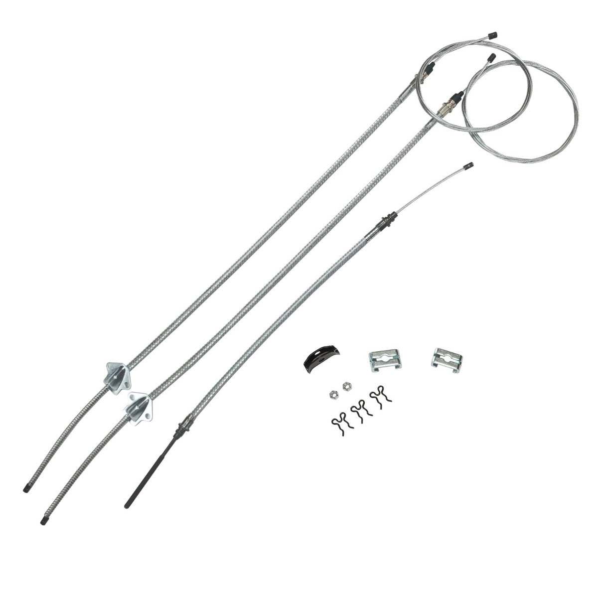 This complete parking brake cable kit replaces all the parking brake cables on your vehicle and includes the front, intermediate, and rear cables as well as all pictured hardware.