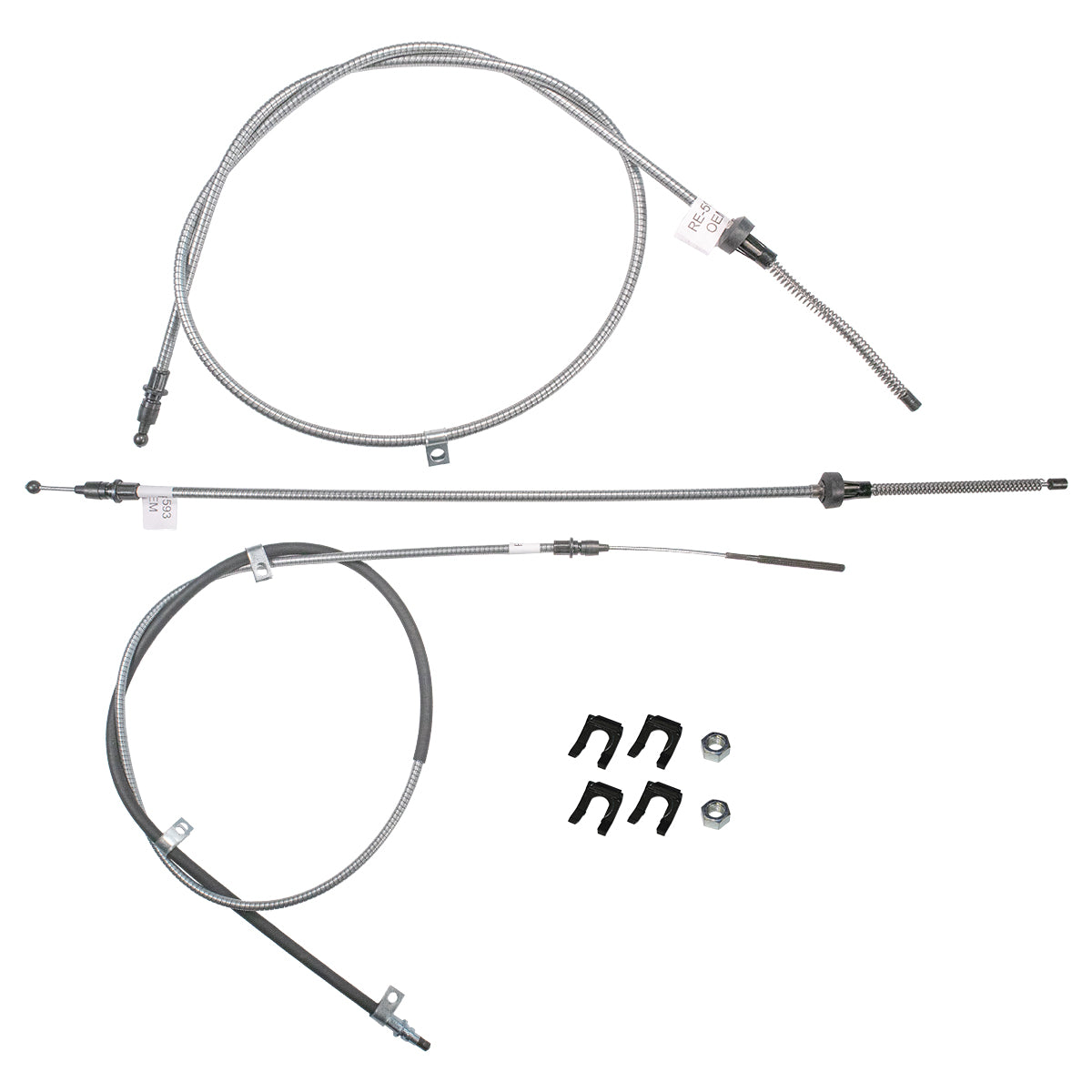 This complete parking brake cable kit replaces all the parking brake cables on your vehicle and includes the front, intermediate, and rear cables as well as all pictured hardware.