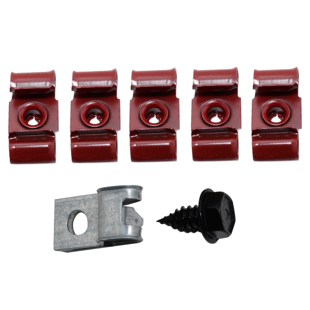 This clip kit includes all clips necessary to secure all the fuel lines to the chassis of the car: five red rivet clips, one R style clip, and one bolt.