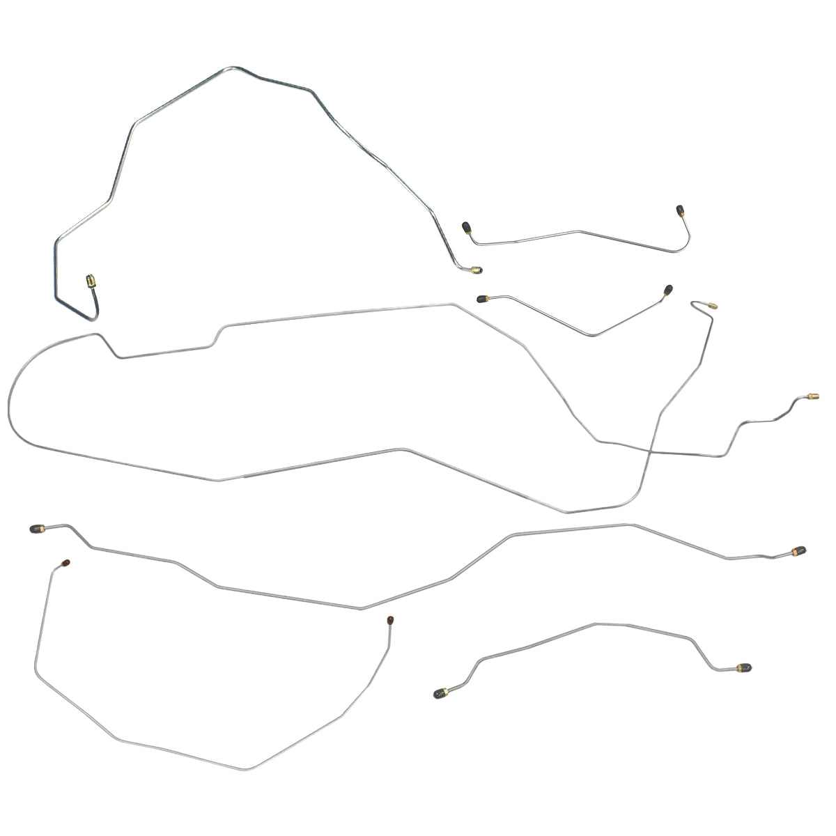 This preformed complete brake line kit will replace all the metal brake lines on your vehicle and includes the master cylinder lines, left front line and right-front crossover line, intermediate lines, and rear axle lines/trailing arm lines.