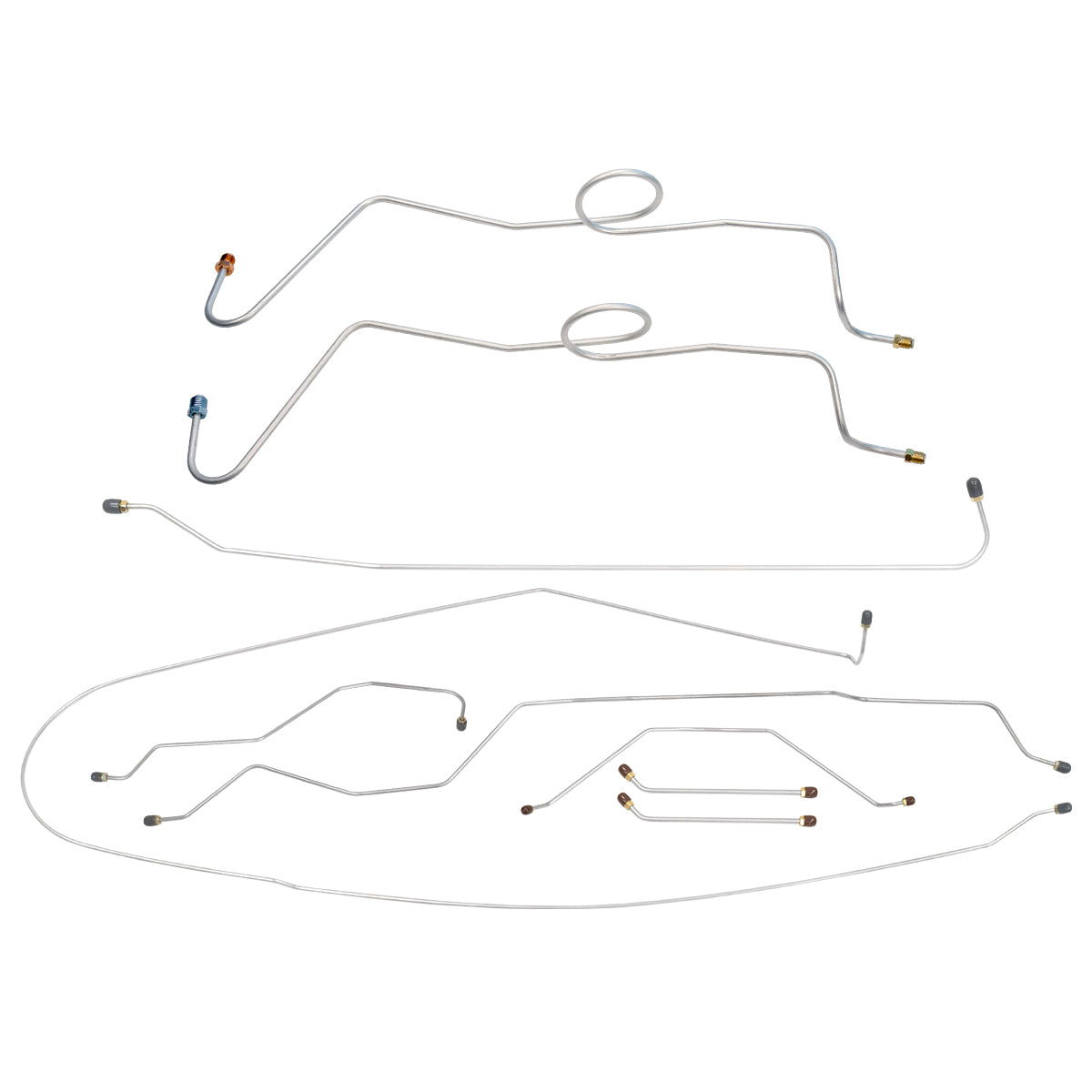 This preformed complete brake line kit will replace all the metal brake lines on your vehicle and includes the master cylinder lines, left front line and right-front crossover line, intermediate lines, and rear axle lines/trailing arm lines.