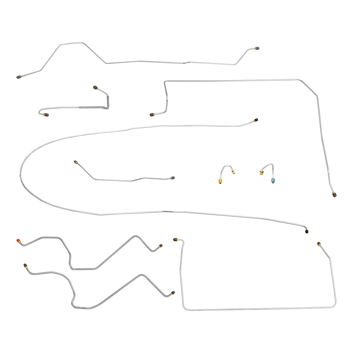 This preformed complete brake line kit will replace all the metal brake lines on your vehicle and includes the master cylinder lines, left front line and right-front crossover line, intermediate lines, and rear axle lines/trailing arm lines.