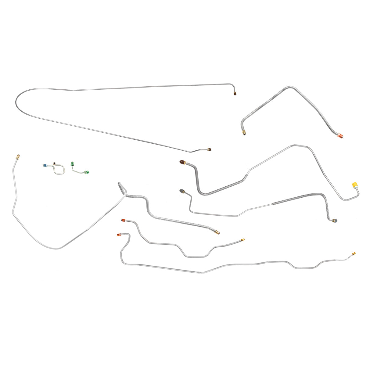 This preformed complete brake line kit will replace all the metal brake lines on your vehicle and includes the master cylinder lines, left front line and right-front crossover line, intermediate lines, and rear axle lines/trailing arm lines.