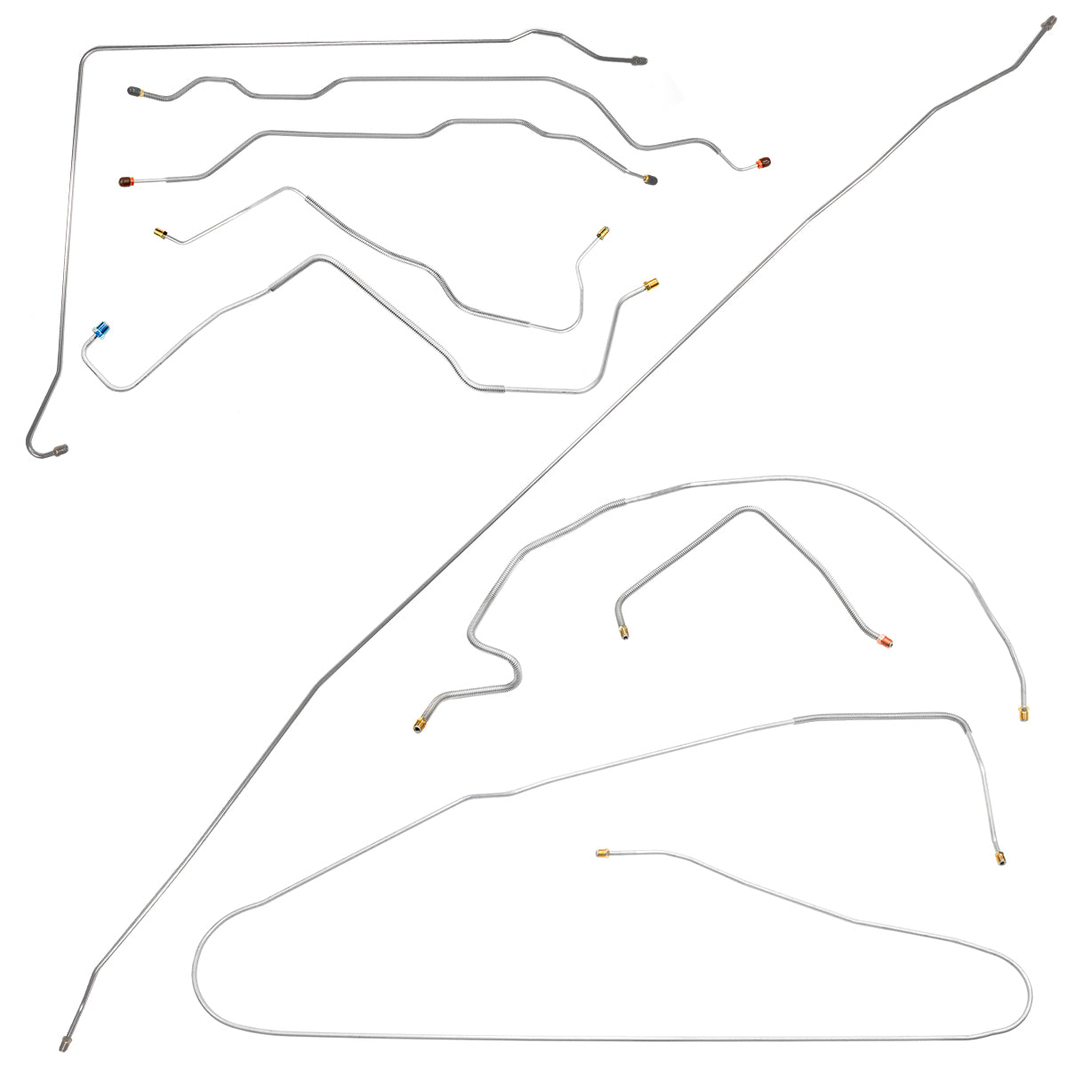 This preformed complete brake line kit will replace all the metal brake lines on your vehicle and includes the master cylinder lines, left front line and right-front crossover line, intermediate lines, and rear axle lines/trailing arm lines.