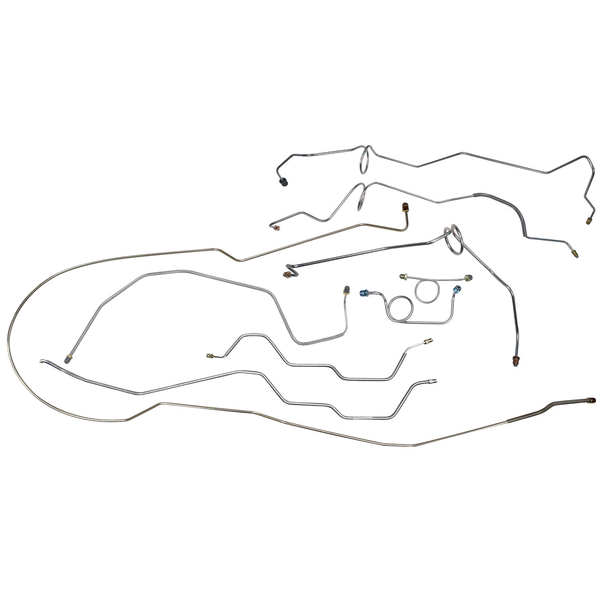 This preformed complete brake line kit will replace all the metal brake lines on your vehicle and includes the master cylinder lines, left front line and right front crossover line, intermediate lines, and rear axle lines/trailing arm lines.