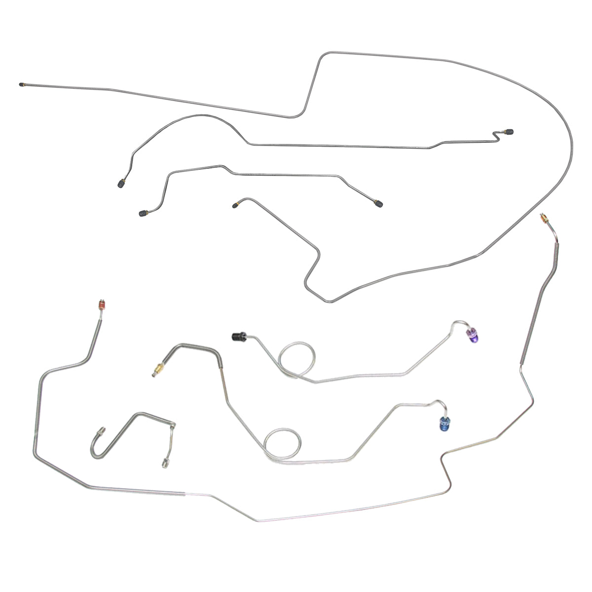 This preformed complete brake line kit will replace all the metal brake lines on your vehicle and includes the master cylinder lines, left front line and right-front crossover line, intermediate lines, and rear axle lines/trailing arm lines.