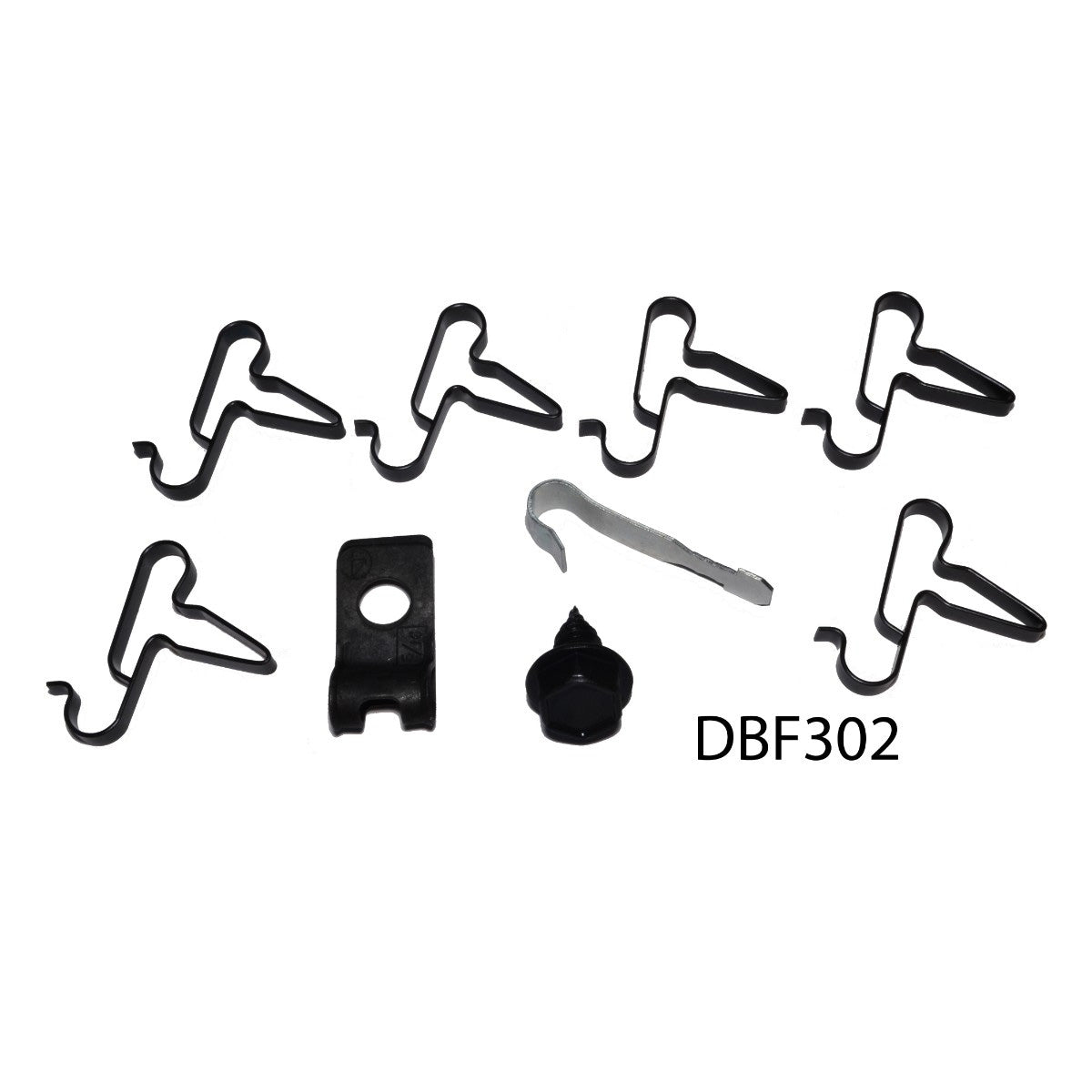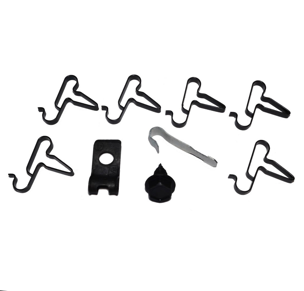 This clip kit includes all clips necessary to secure the fuel lines to the chassis of the car: six line clamps, one ’J’ clip, one R style clip, and one bolt.