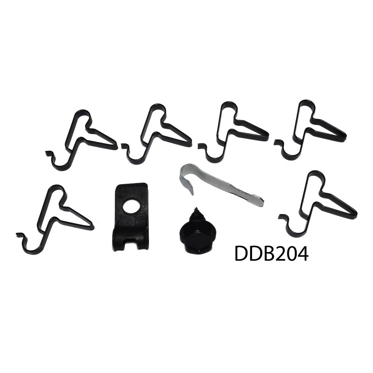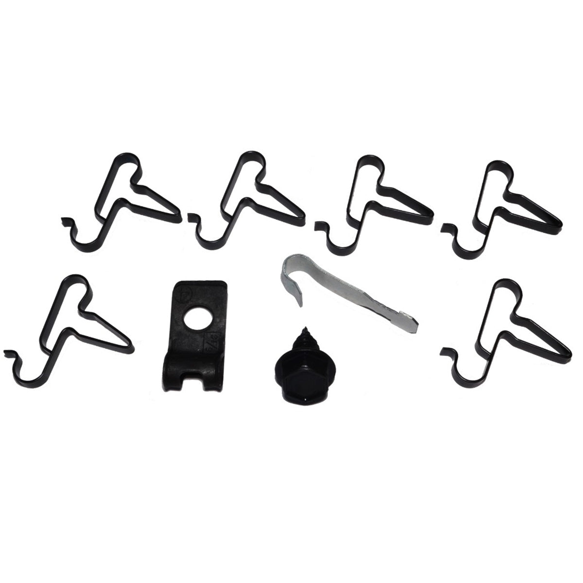 This clip kit includes all clips necessary to secure the brake lines to the chassis of the car: six line clamps, one R style clip, one ’J’ clip, and one bolt.