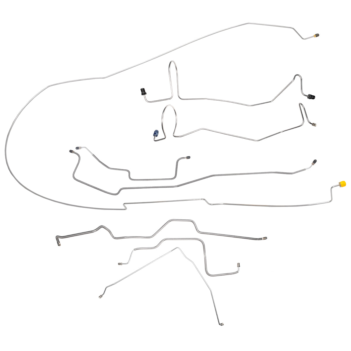 This preformed complete brake line kit will replace all the metal brake lines on your vehicle and includes the master cylinder lines, left front line and right front crossover line, intermediate lines, and rear axle lines/trailing arm lines.
