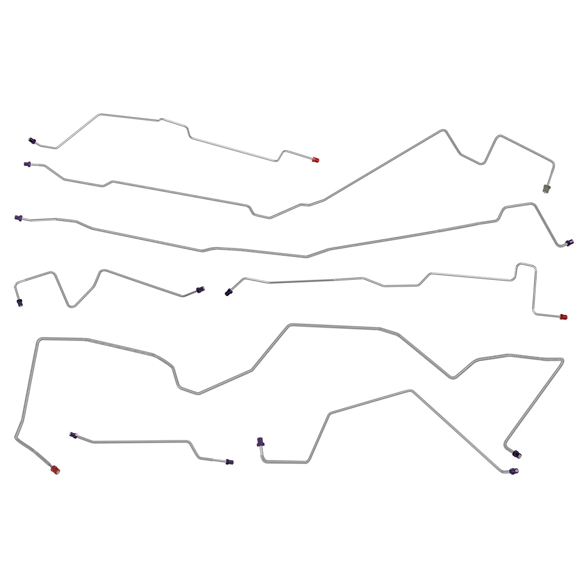 This preformed complete brake line kit will replace all the metal brake lines on your vehicle and includes the master cylinder lines, left front line and right front crossover line, intermediate lines, and rear axle lines/trailing arm lines.