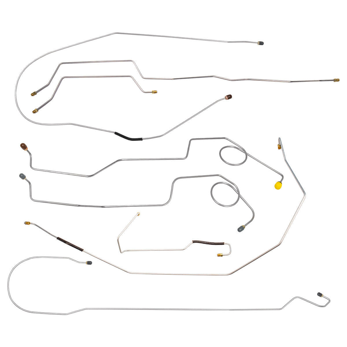 This preformed complete brake line kit will replace all the metal brake lines on your vehicle and includes the master cylinder lines, left front line and right-front crossover line, intermediate lines, and rear axle lines/trailing arm lines.