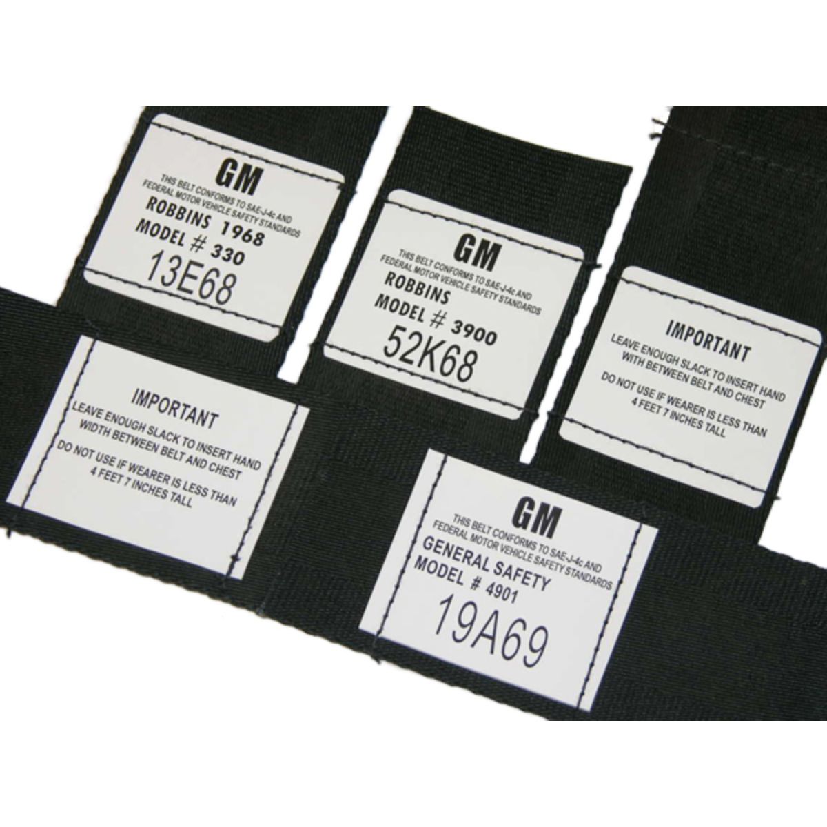 This set of CUSTOM MADE seat belt tags, found on the end of each belt, is for all A & F-bodies from 1968-1972. This set contains enough to do your car's bench or bucket seats. After years of exposure in your interior, they are wrinkled, ripped, stained, missing, and yellow. Now you can replace them. This set is for the date code you choose, e.g., "13-K-69," which is the 13th week of 1969 from belt assembly line K, so about the first week in March. Since the seat belts are dated three months before the car's build date, this example tag would work for cars produced from December to March. Sometimes, there were different date codes in the same set, but this set will be all the same date. There were also many manufacturers, Robbins, General Safety, DAAL, Irvin, Irving, BAY TRIM, and others. The tags also changed from year to year and manufacturer to manufacturer, and each manufacturer had a different part number and sometimes a different shape tag.
