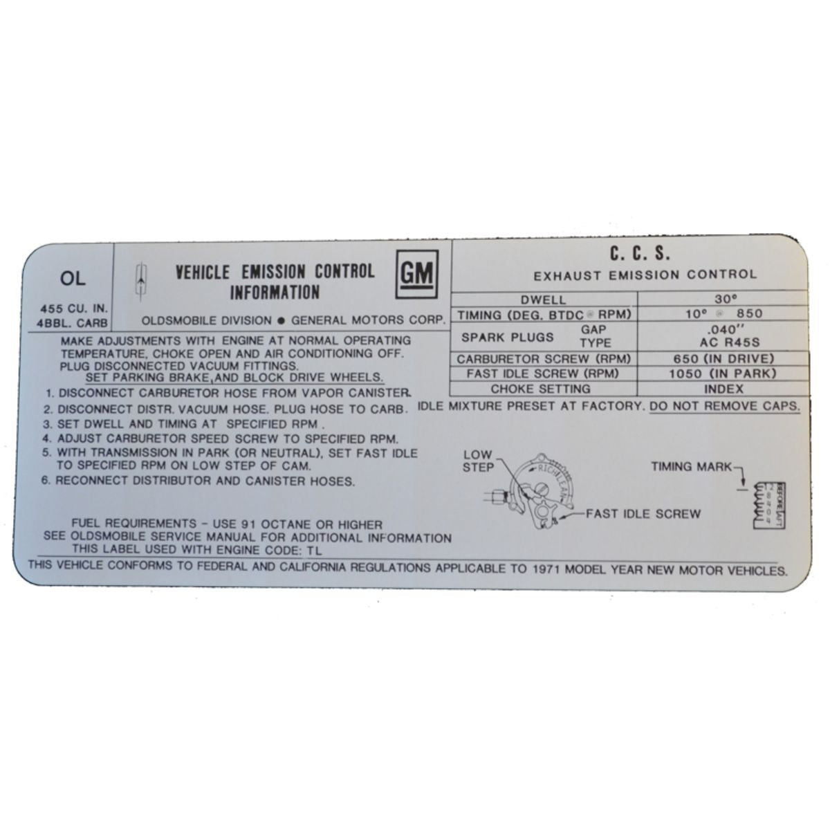 1971 Oldsmobile Cutlass Tune Up Decal 442 With AC W-30 OL 455 Automatic Trans 1pc