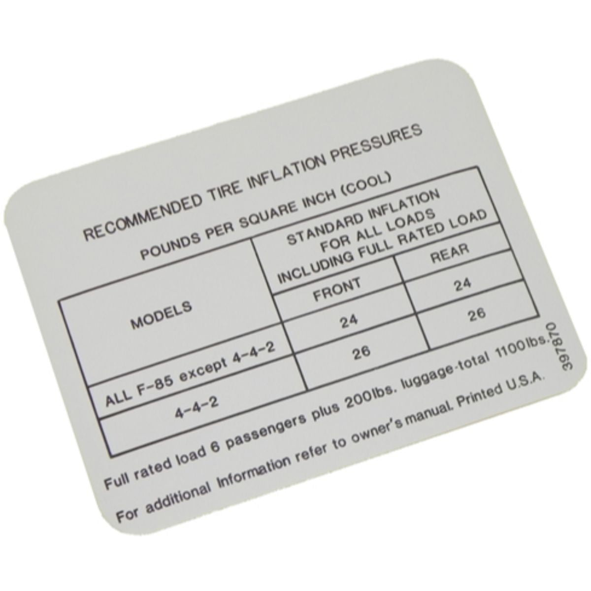 1967 Oldsmobile Cutlass Tire Pressure Decal 1pc