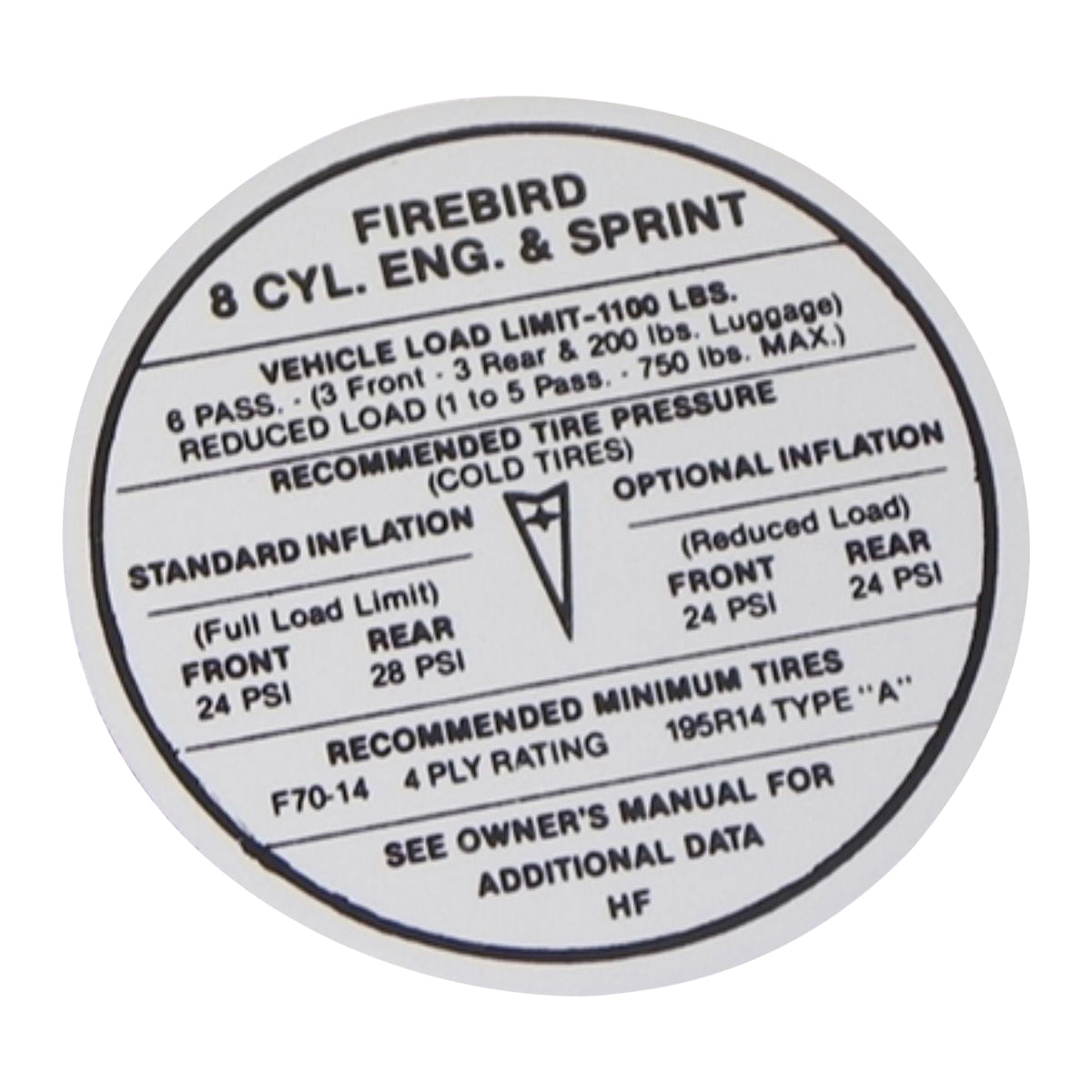 1968 Pontiac Firebird Glove Box Tire Pressure Decal