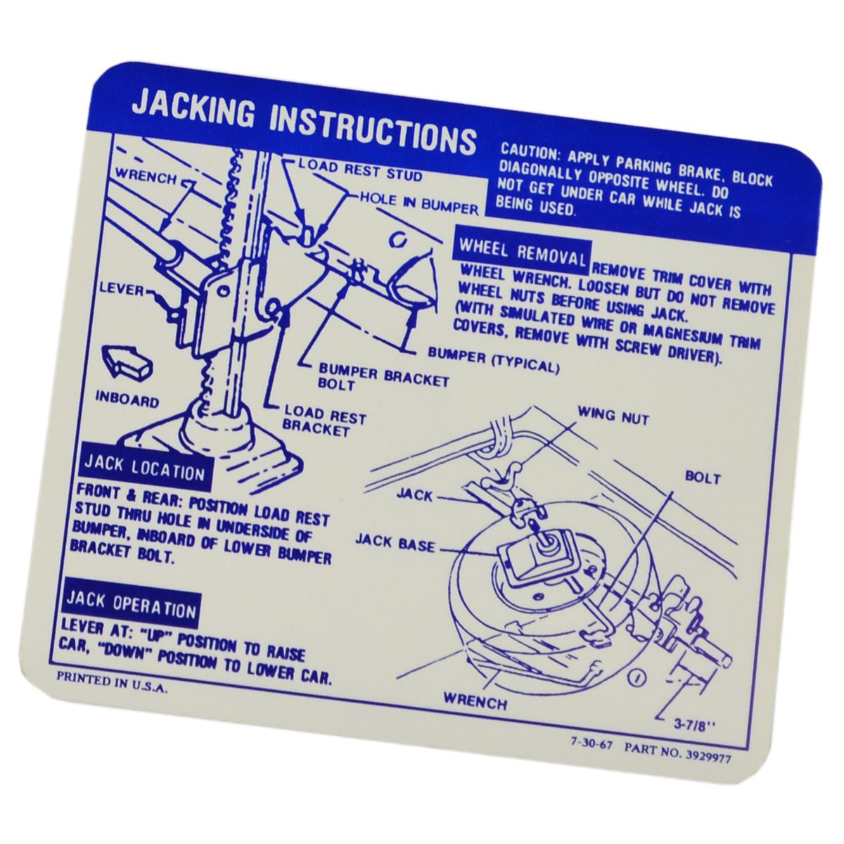 1968 Chevrolet Camaro Convertible 396's & SS Jacking Instructions.
