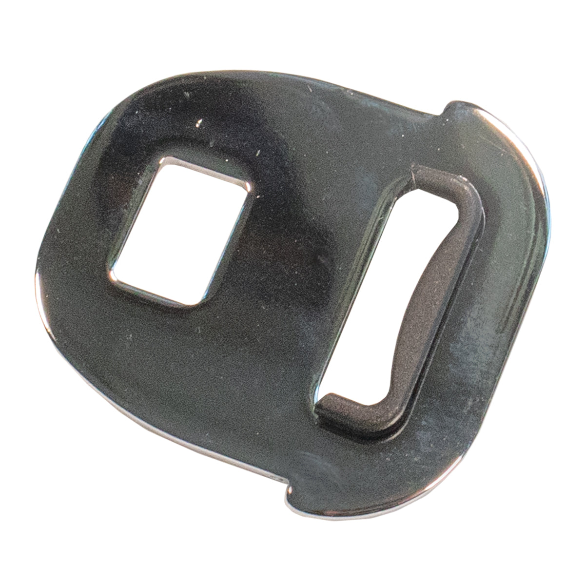 Used on the end of the seat belt lap belt to snap into the female receiver. Used for front and rear belts. 1-7/8 X 1-7/8 Tongue 1-5/8" Wide With Plastic Insert