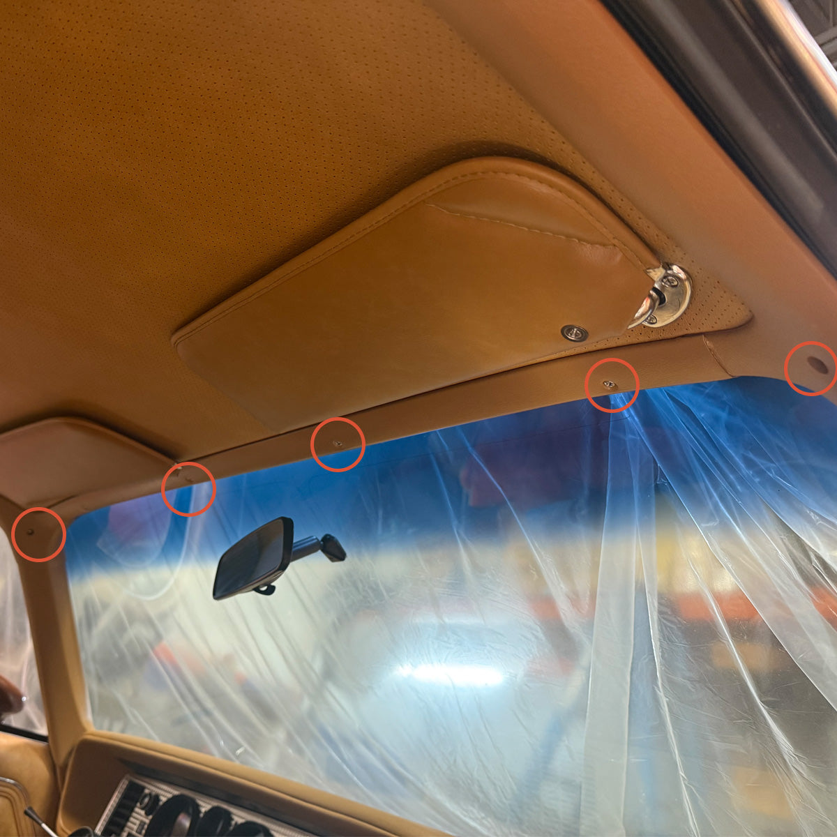 This kit includes all the needed screws to attach the headliner trim. This kit includes the screws for the front, rear, corners, and sail panels plus the Christmas tree retainers for the sail panels.