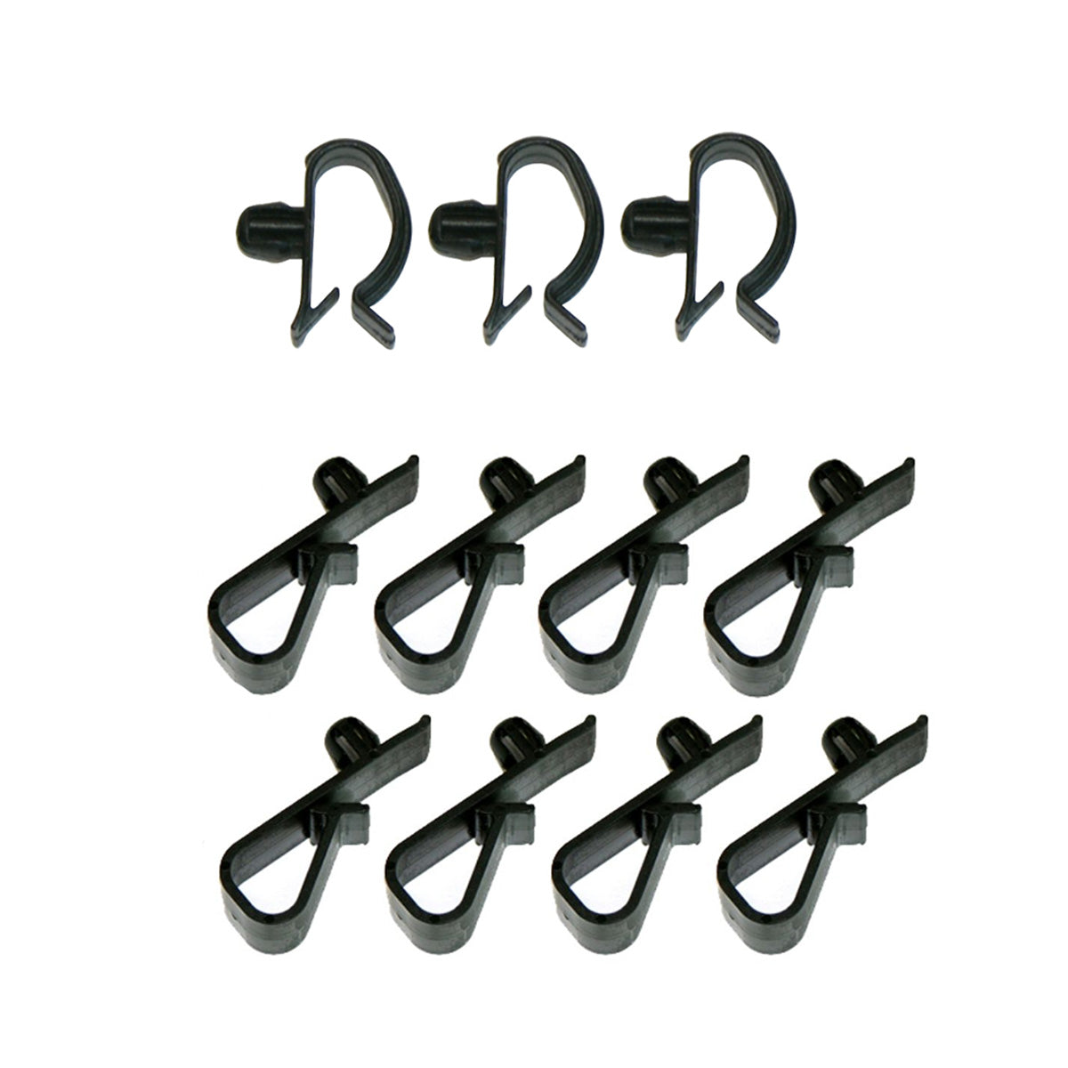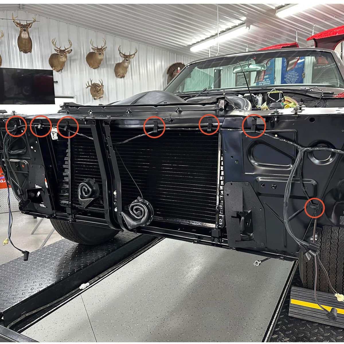 Designed for the front core support area, these clips secure the engine compartment wiring harness in the original factory locations. This kit includes the two different styles of clips used, each manufactured to OEM dimensions and finish for accurate fit and appearance. The complete 11-piece set provides all necessary retainers for proper harness routing and restoration accuracy.