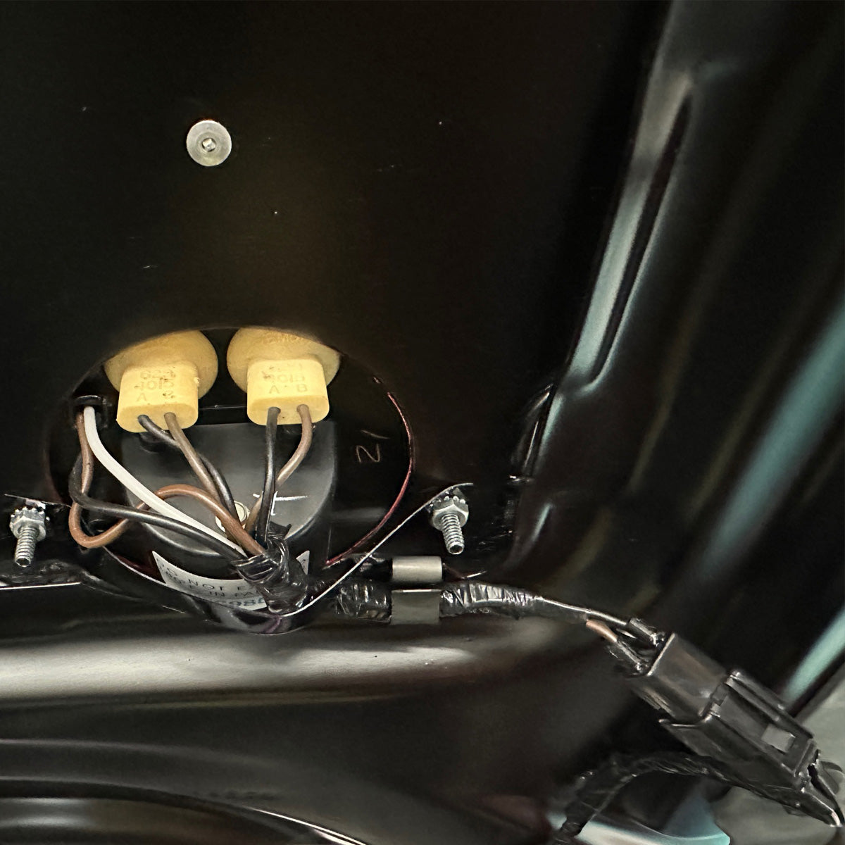 This hood tach wiring hardware kit is intended to make a reproduction or aftermarket hood-mounted tachometer appear factory correct. The kit includes three meter mounting screws, with two longer screws used for the upper portion of the meter mounting and one shorter screw used for the lower portion. Installation requires removal of the incorrect screws and drilling the aluminum plate mounting hole to 0.125 inch (1/8 inch) and the screw hole in the plastic housing to 0.152 inch (5/32 inch). The included wiring water boots are designed to seal and protect the tachometer wiring and may be installed by sliding them over the wires or by carefully slicing the boot lengthwise to install without disassembling the wiring. Adhesive may be used to seal the seam and secure the boot to the plastic connector if required. These details replicate the configuration used on factory-installed hood tachometers.