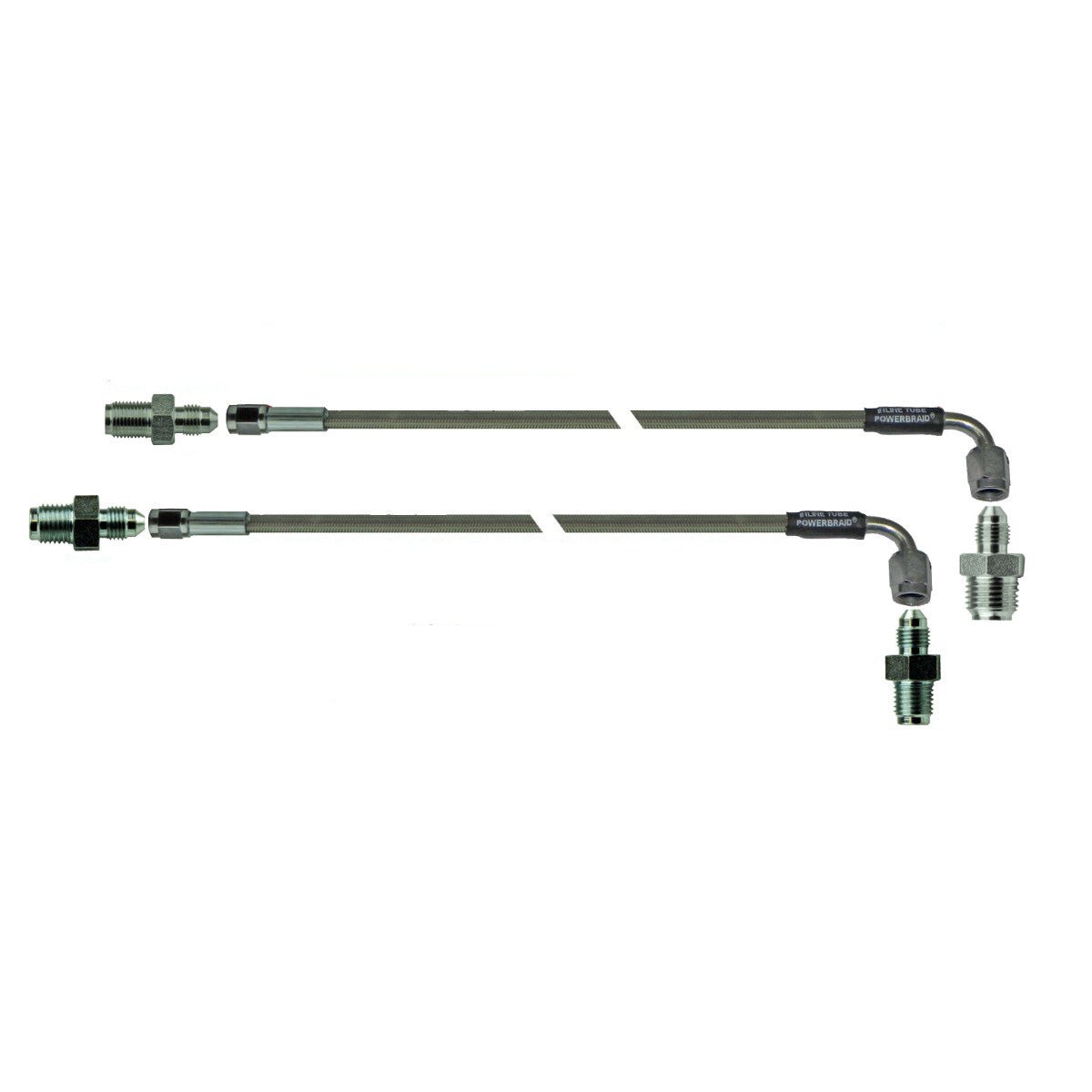 This kit includes two 21” hoses: one with a 9/16”-18 male end and a 7/16”-24 male end, one with a 1/2”-20 male end to 1/2”-20 male end. These are intended to be used as master cylinder lines.