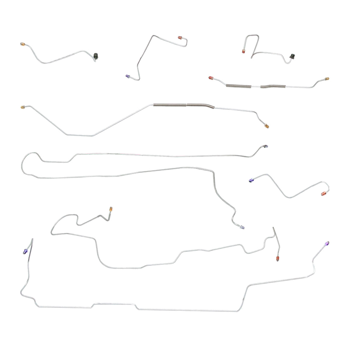 This preformed complete brake line kit will replace all the metal brake lines on your vehicle and includes the master cylinder lines, left front line and right-front crossover line, intermediate lines, and rear axle lines/trailing arm lines.