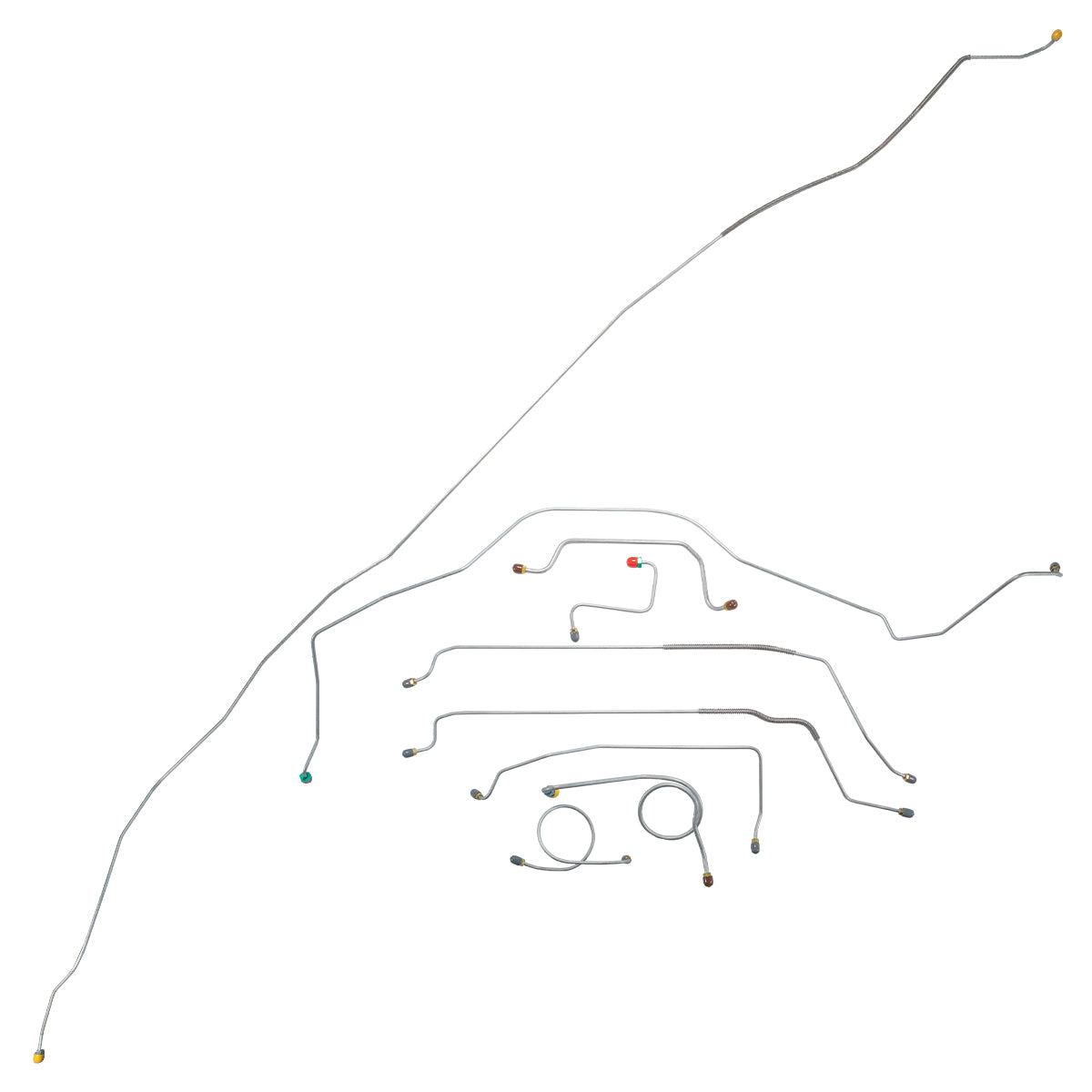 This preformed complete brake line kit will replace all the metal brake lines on your vehicle and includes the master cylinder lines, left front line and right-front crossover line, intermediate lines, and rear axle lines/trailing arm lines.