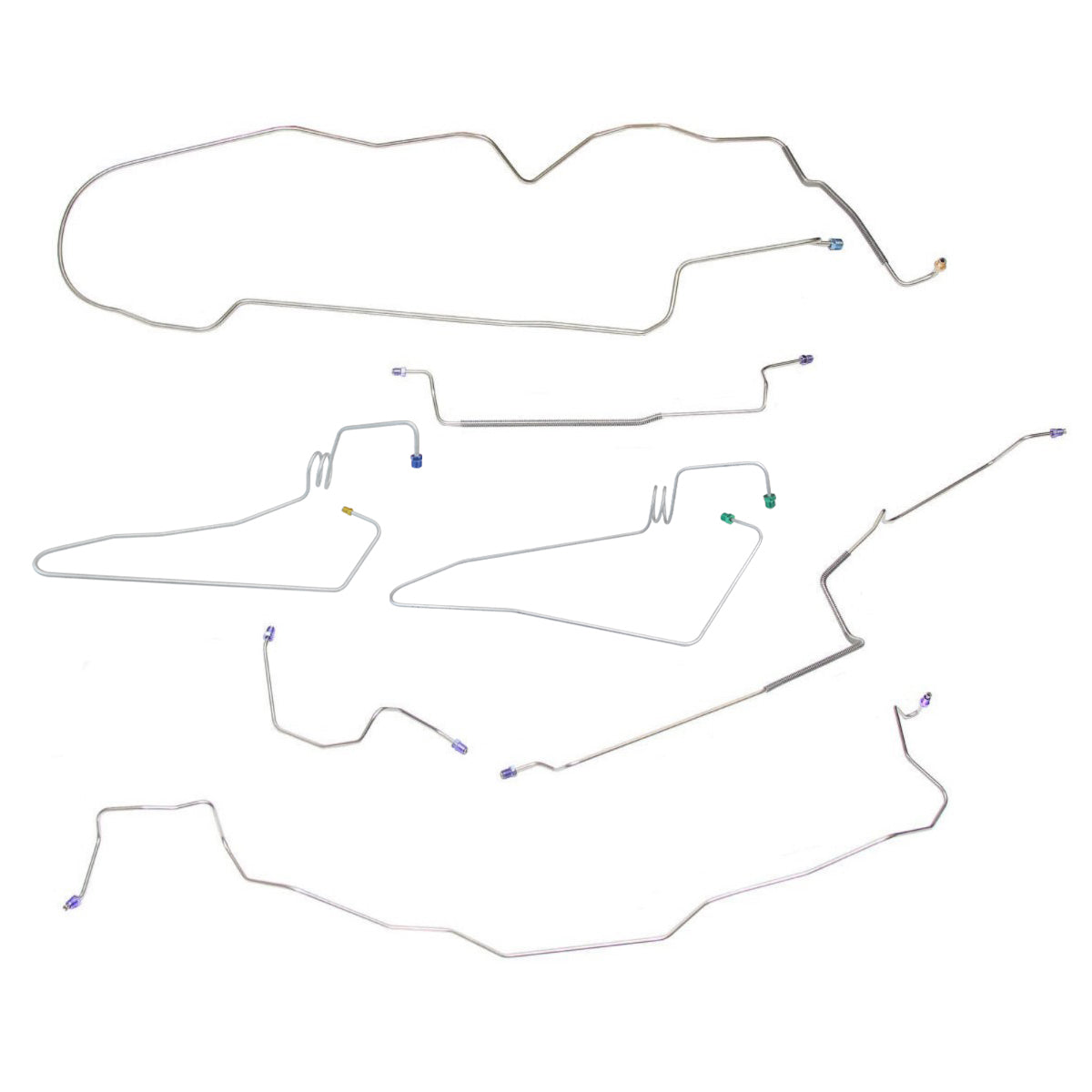 This preformed complete brake line kit will replace all the metal brake lines on your vehicle and includes the master cylinder lines, left front line and right-front crossover line, intermediate lines, and rear axle lines/trailing arm lines.