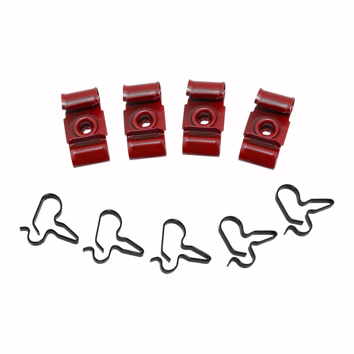 This clip kit includes all clips necessary to secure all the brake lines to the chassis of the car: five push-in clips and four red rivet clips.