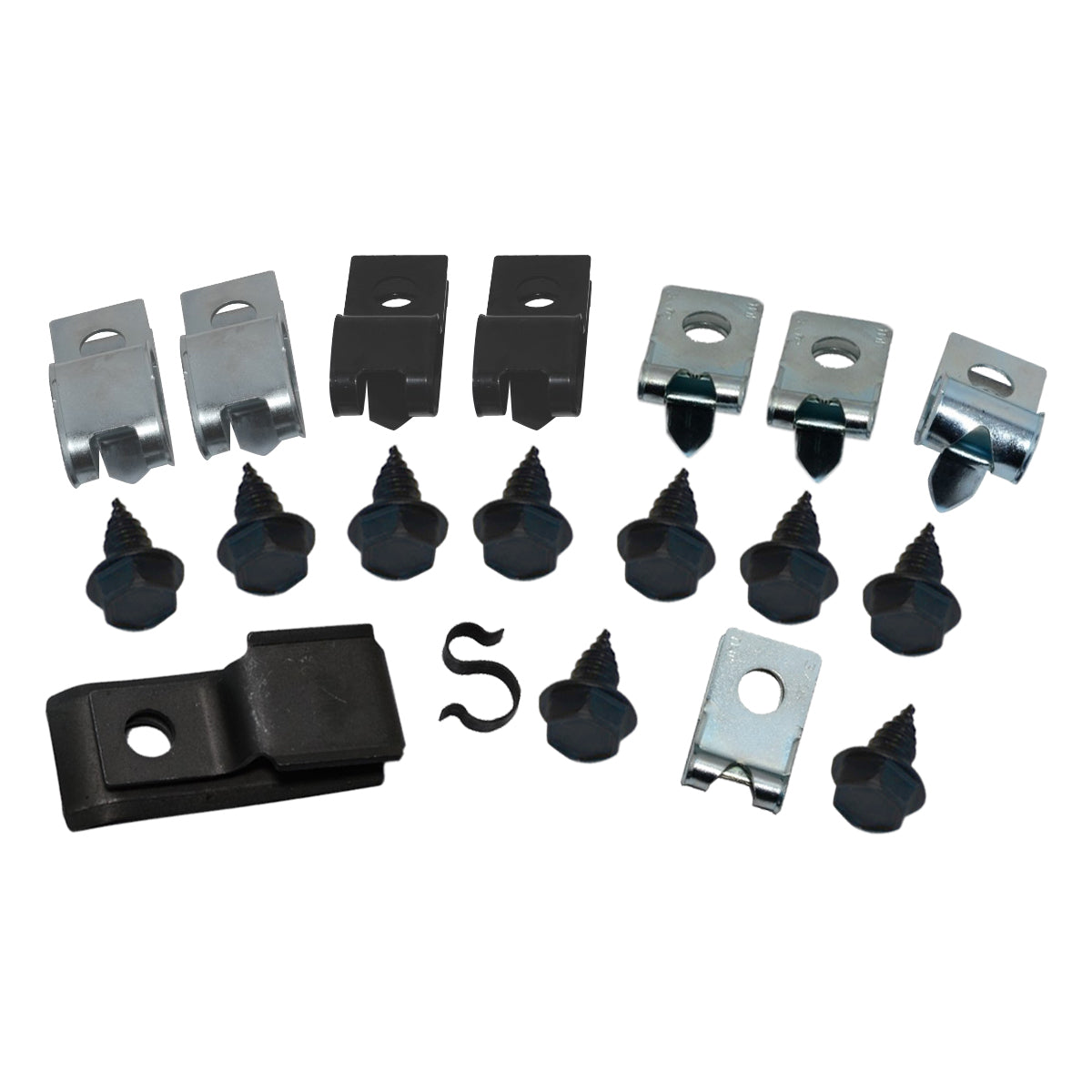 This clip kit includes all clips necessary to secure all the brake lines to the chassis of the car: eight R style clips, one ’S’ clip, one frame clip, and nine bolts.