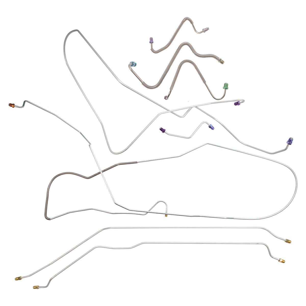 This preformed complete brake line kit will replace all the metal brake lines on your vehicle and includes the master cylinder lines, left front line and right-front crossover line, intermediate lines, and rear axle lines/trailing arm lines.