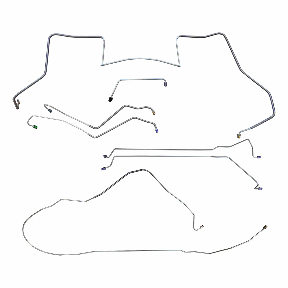 This preformed complete brake line kit will replace all the metal brake lines on your vehicle and includes the master cylinder lines, left front line and right front crossover line, intermediate lines, and rear axle lines/trailing arm lines.