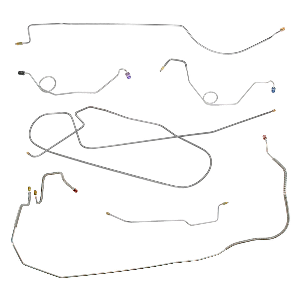 This preformed complete brake line kit will replace all the metal brake lines on your vehicle and includes the master cylinder lines, left front line and right-front crossover line, intermediate lines, and rear axle lines/trailing arm lines.