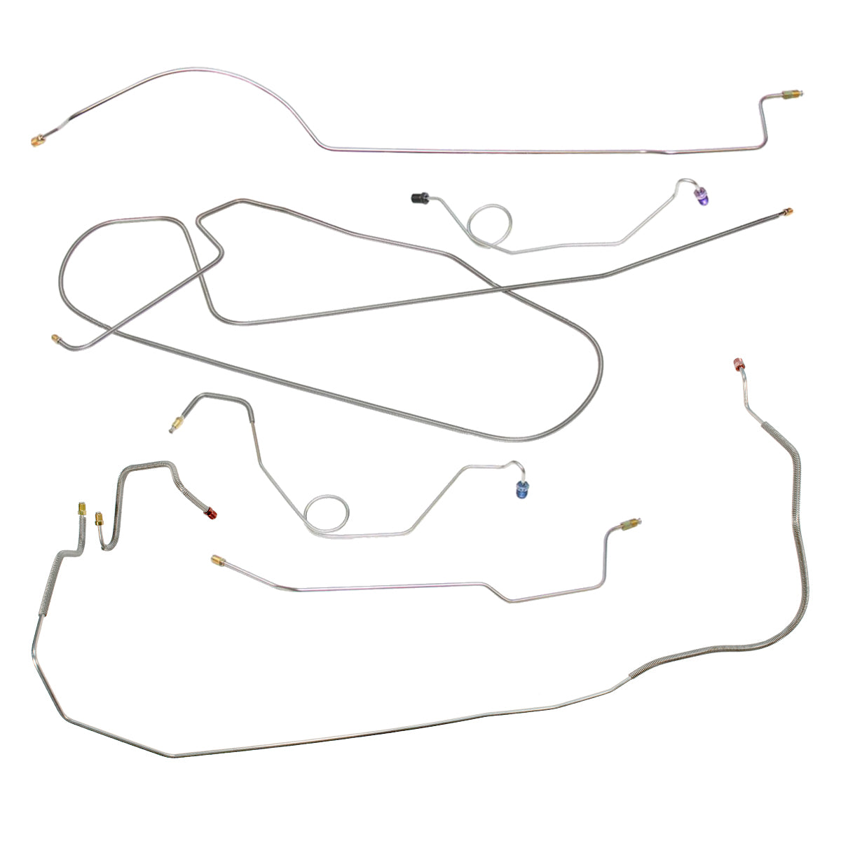 This preformed complete brake line kit will replace all the metal brake lines on your vehicle and includes the master cylinder lines, left front line and right-front crossover line, intermediate lines, and rear axle lines/trailing arm lines.