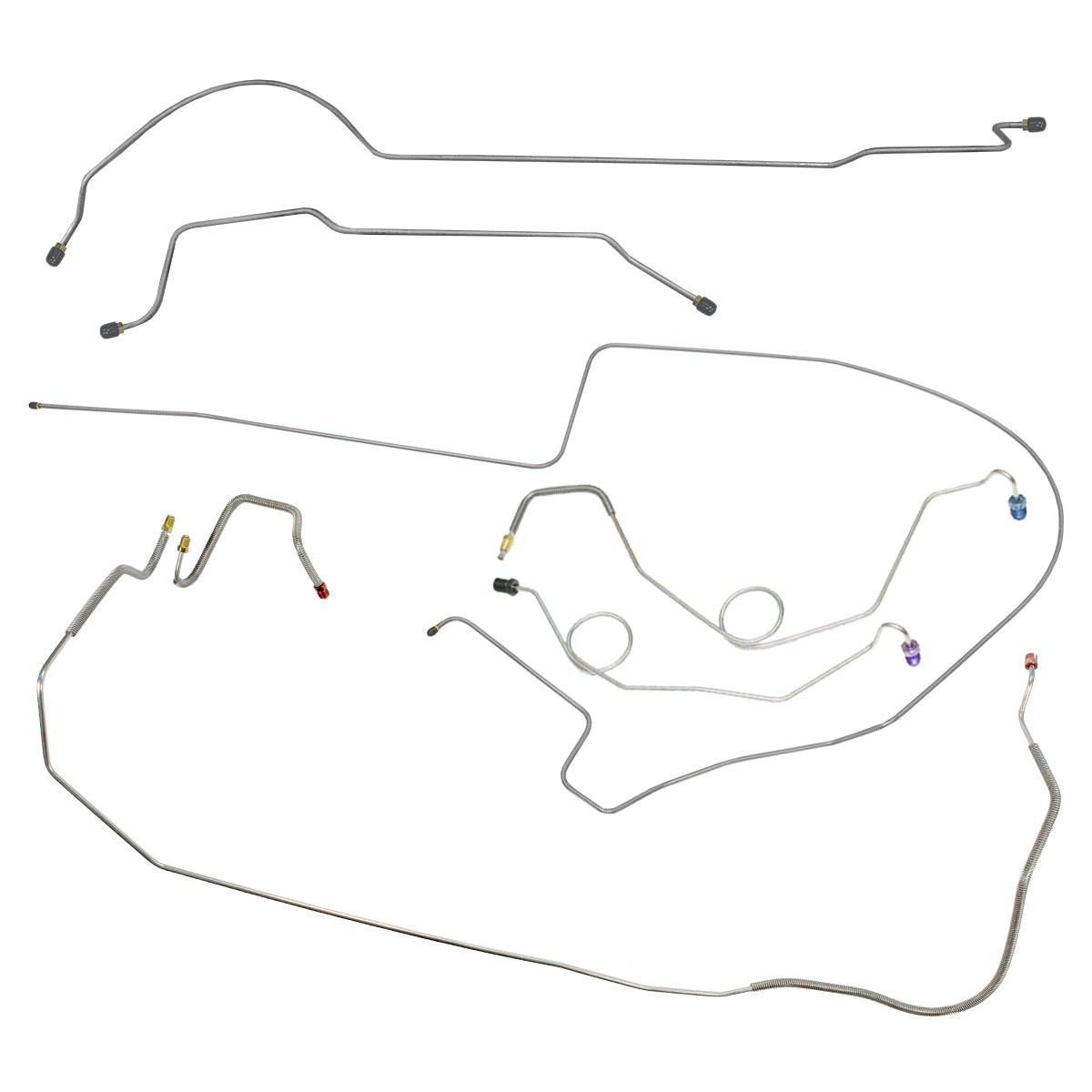 This preformed complete brake line kit will replace all the metal brake lines on your vehicle and includes the master cylinder lines, left front line and right-front crossover line, intermediate lines, and rear axle lines/trailing arm lines.