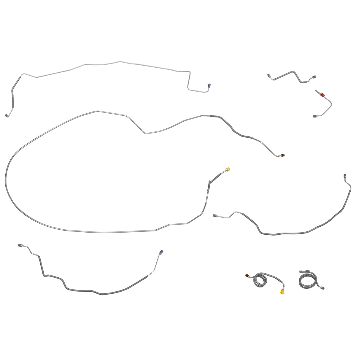 This preformed complete brake line kit will replace all the metal brake lines on your vehicle and includes the master cylinder lines, left front line and right front crossover line, intermediate lines, and rear axle lines/trailing arm lines.