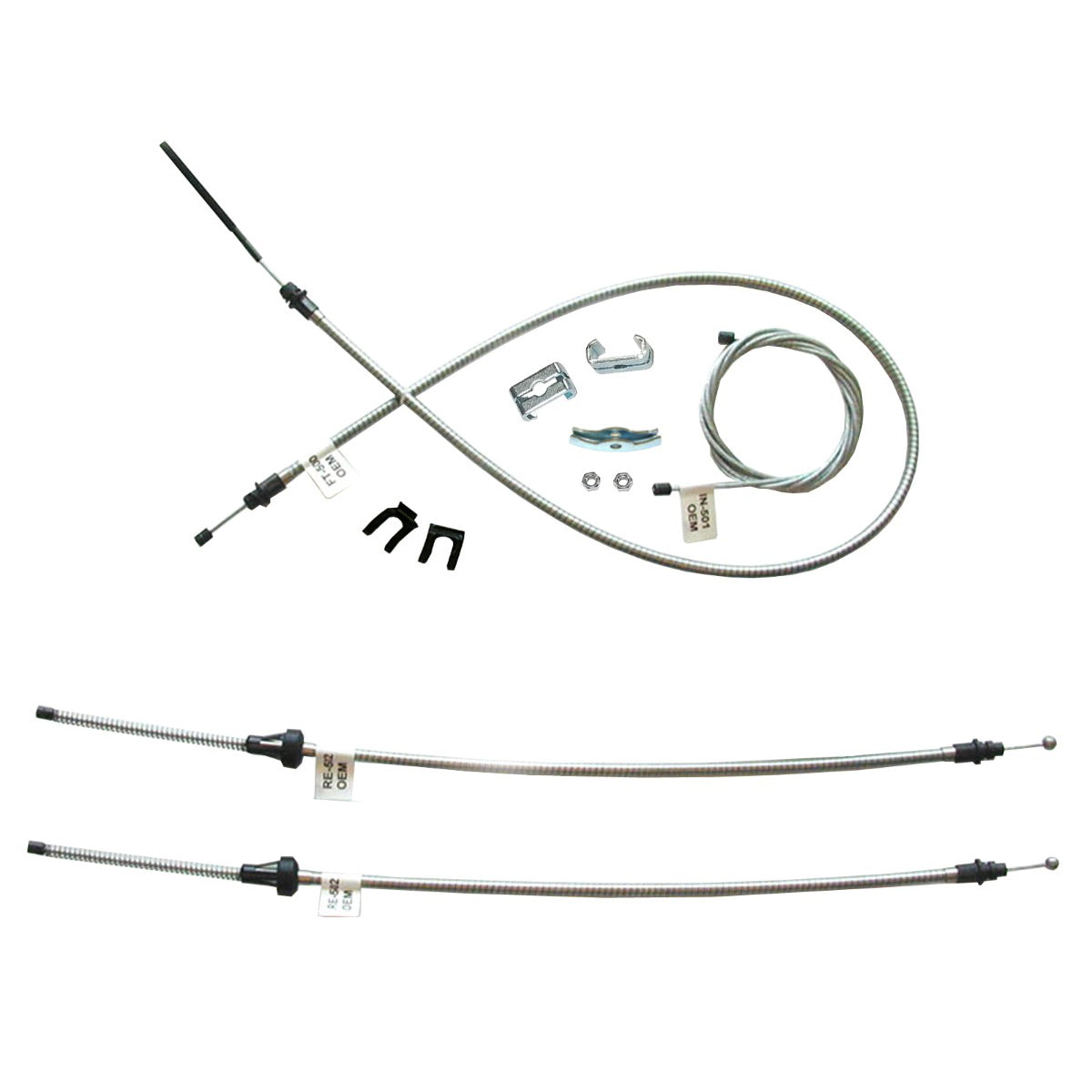 This complete parking brake cable kit replaces all the parking brake cables on your vehicle and includes the front, intermediate, and rear cables as well as all pictured hardware.