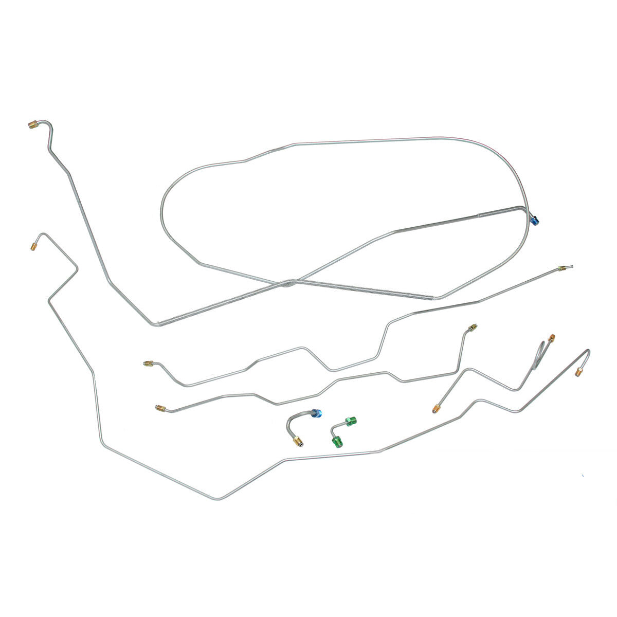 This preformed complete brake line kit will replace all the metal brake lines on your vehicle and includes the master cylinder lines, left front line and right-front crossover line, intermediate lines, and rear axle lines/trailing arm lines.