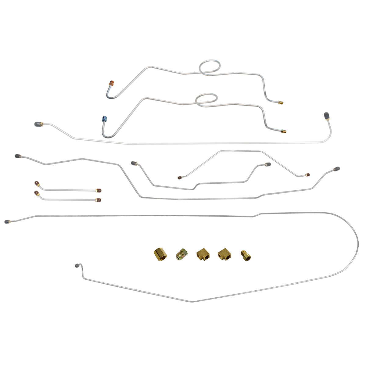 This preformed complete brake line kit will replace all the metal brake lines on your vehicle and includes the master cylinder lines, left front line and right-front crossover line, intermediate lines, and rear axle lines/trailing arm lines.