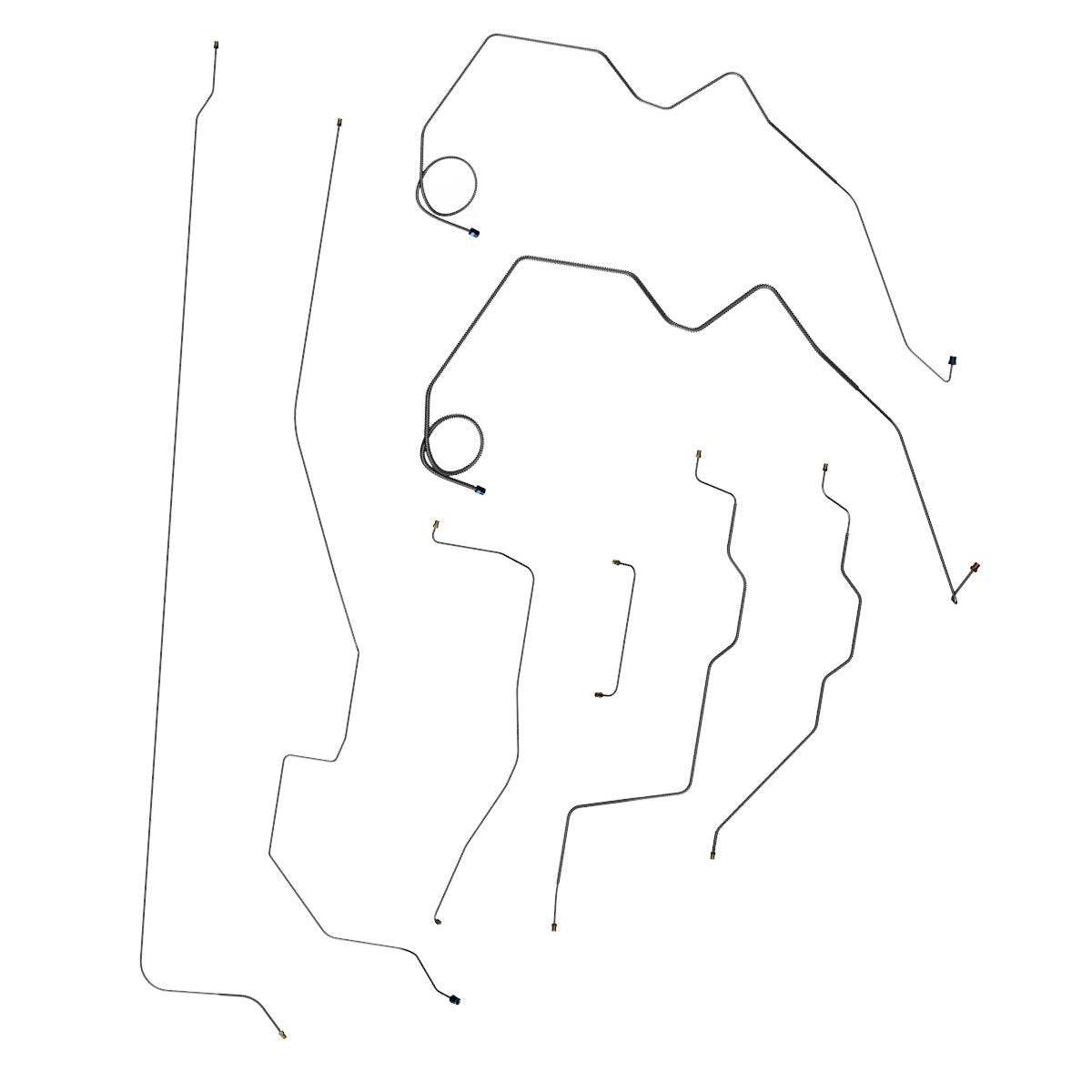 This preformed complete brake line kit will replace all the metal brake lines on your vehicle and includes the master cylinder lines, left front line and right front crossover line, intermediate lines, and rear axle lines/trailing arm lines.