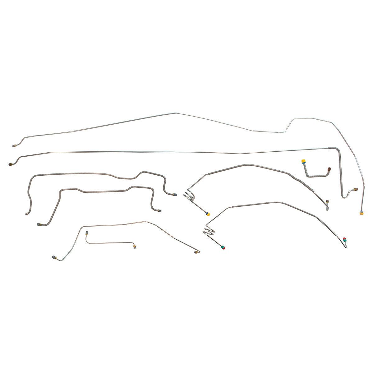 This preformed complete brake line kit will replace all the metal brake lines on your vehicle and includes the master cylinder lines, left front line and right front crossover line, intermediate lines, and rear axle lines/trailing arm lines.