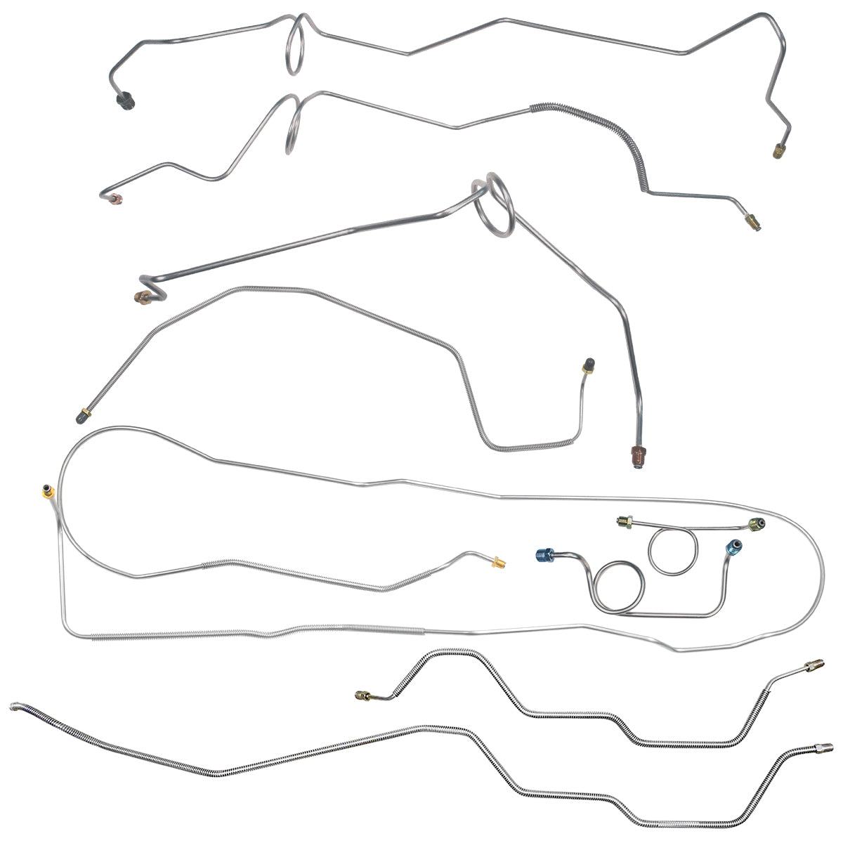 This preformed complete brake line kit will replace all the metal brake lines on your vehicle and includes the master cylinder lines, left front line and right front crossover line, intermediate lines, and rear axle lines/trailing arm lines.