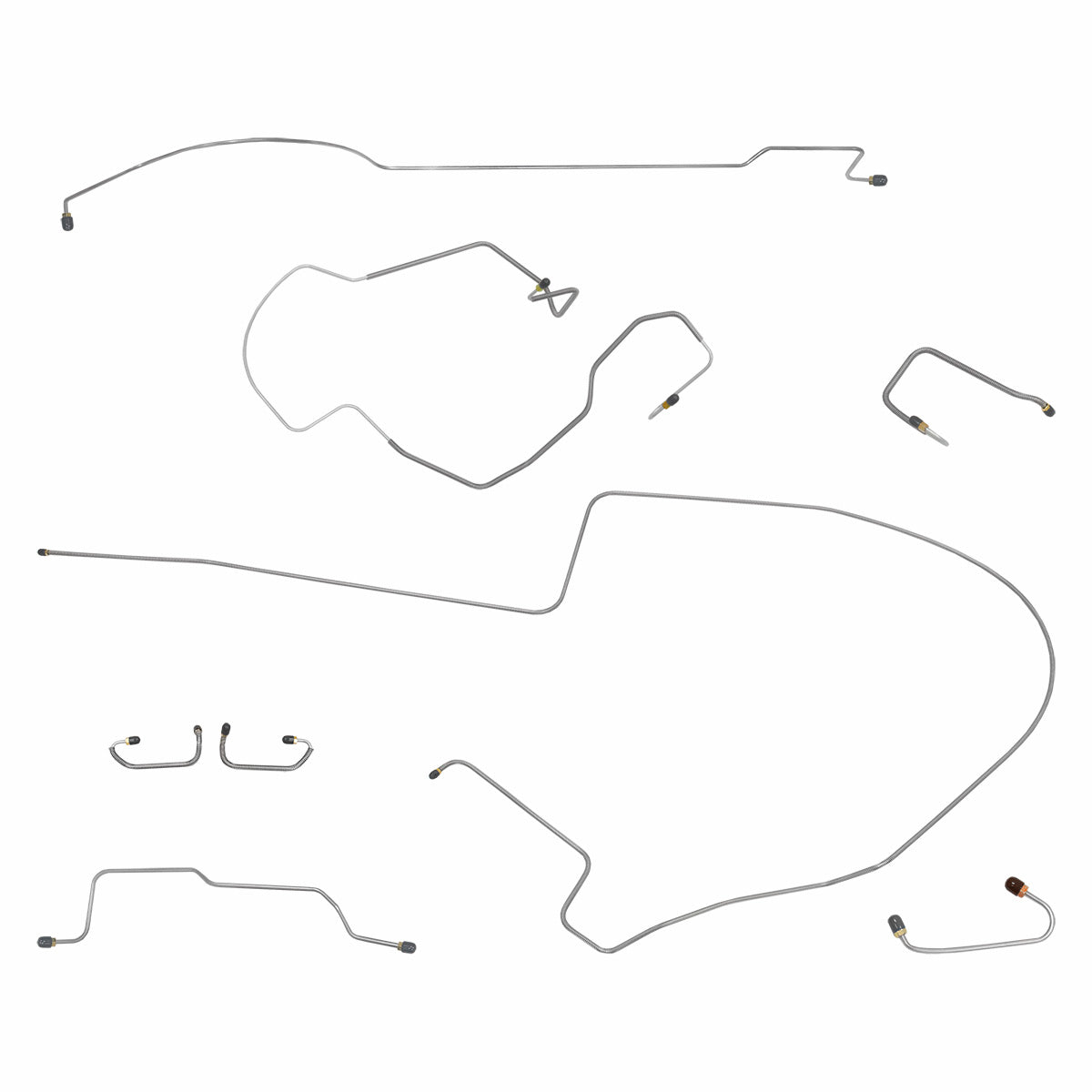 This preformed complete brake line kit will replace all the metal brake lines on your vehicle and includes the master cylinder lines, left front line and right-front crossover line, intermediate lines, and rear axle lines/trailing arm lines.