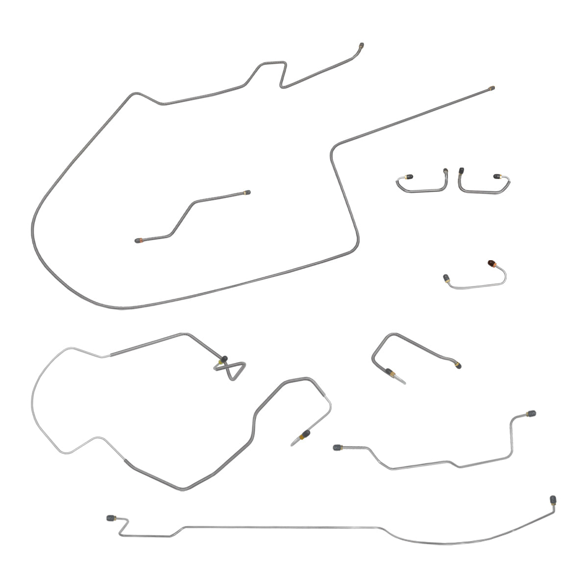 This preformed complete brake line kit will replace all the metal brake lines on your vehicle and includes the master cylinder lines, left front line and right-front crossover line, intermediate lines, and rear axle lines/trailing arm lines.