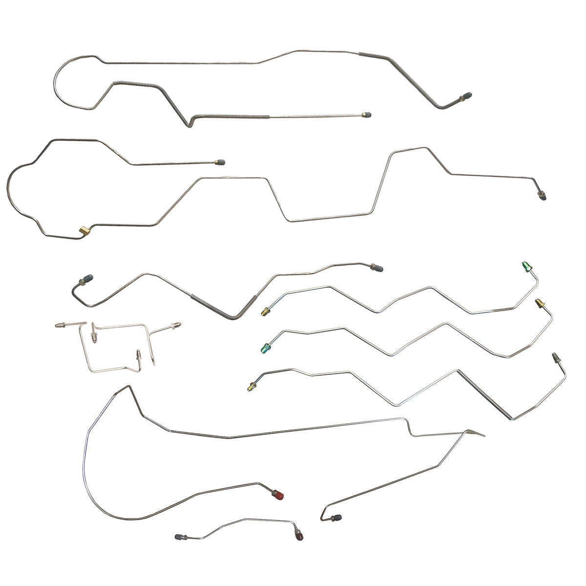 This preformed complete brake line kit will replace all the metal brake lines on your vehicle and includes the master cylinder lines, left front line and right-front crossover line, intermediate lines, and rear axle lines/trailing arm lines.