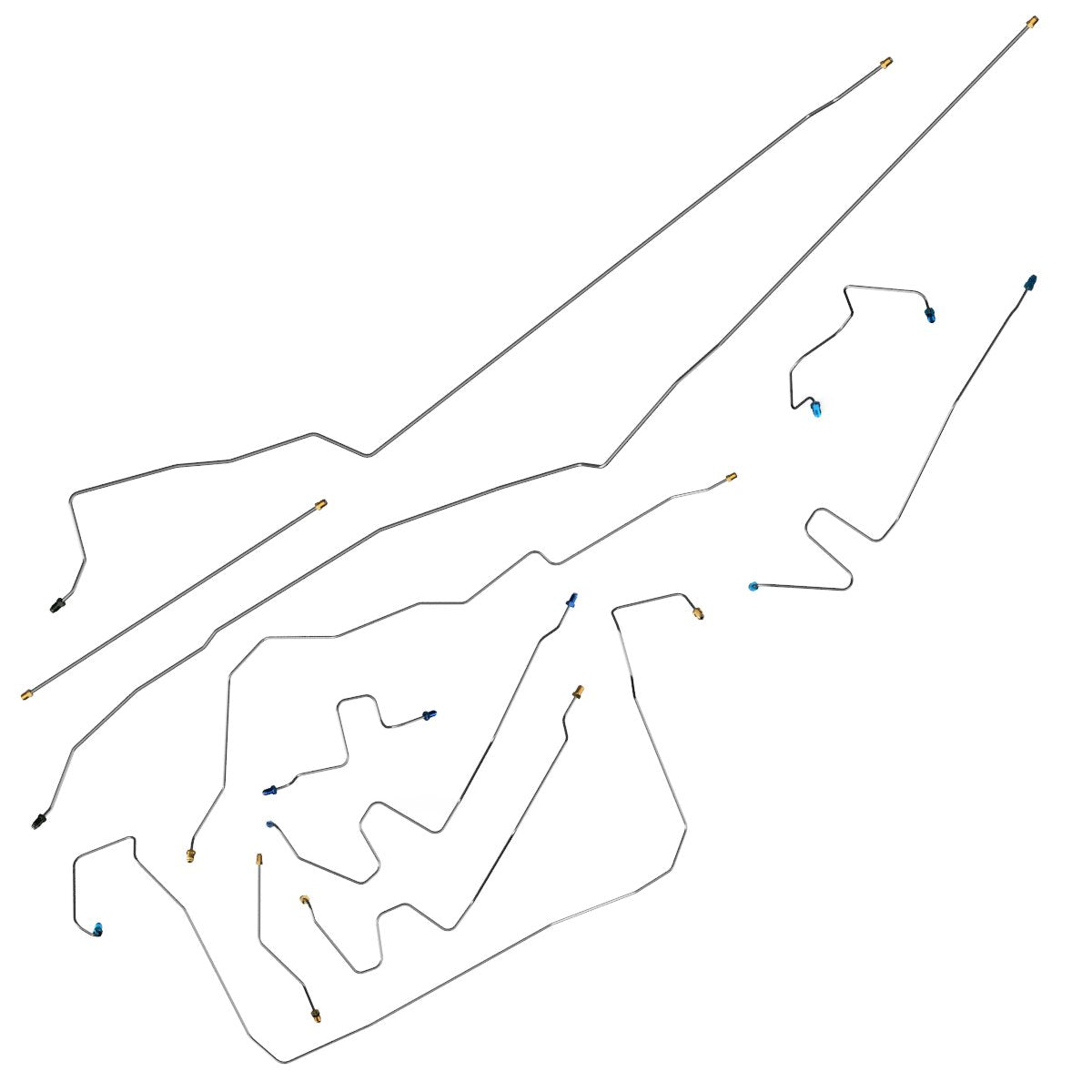 This preformed complete brake line kit will replace all the metal brake lines on your vehicle and includes the master cylinder lines, left front line and right-front crossover line, intermediate lines, and rear axle lines/trailing arm lines.
