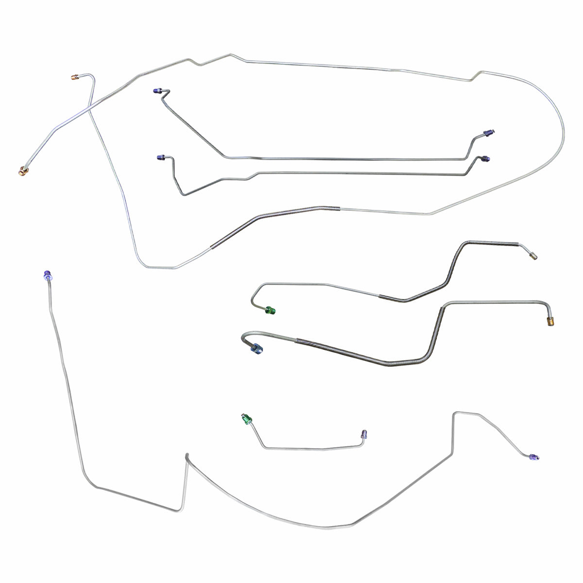 This preformed complete brake line kit will replace all the metal brake lines on your vehicle and includes the master cylinder lines, left front line and right-front crossover line, intermediate lines, and rear axle lines/trailing arm lines.
